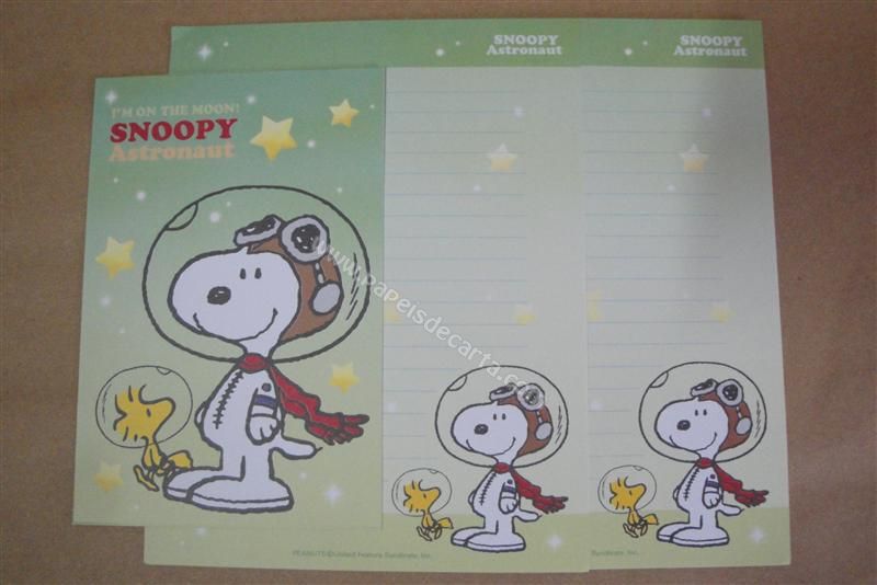 Conjunto importado, de papel de carta com 2 folhas iguais e 1 envelope do Snoopy da linha "SNOOPY Astronaut", na cor verde.