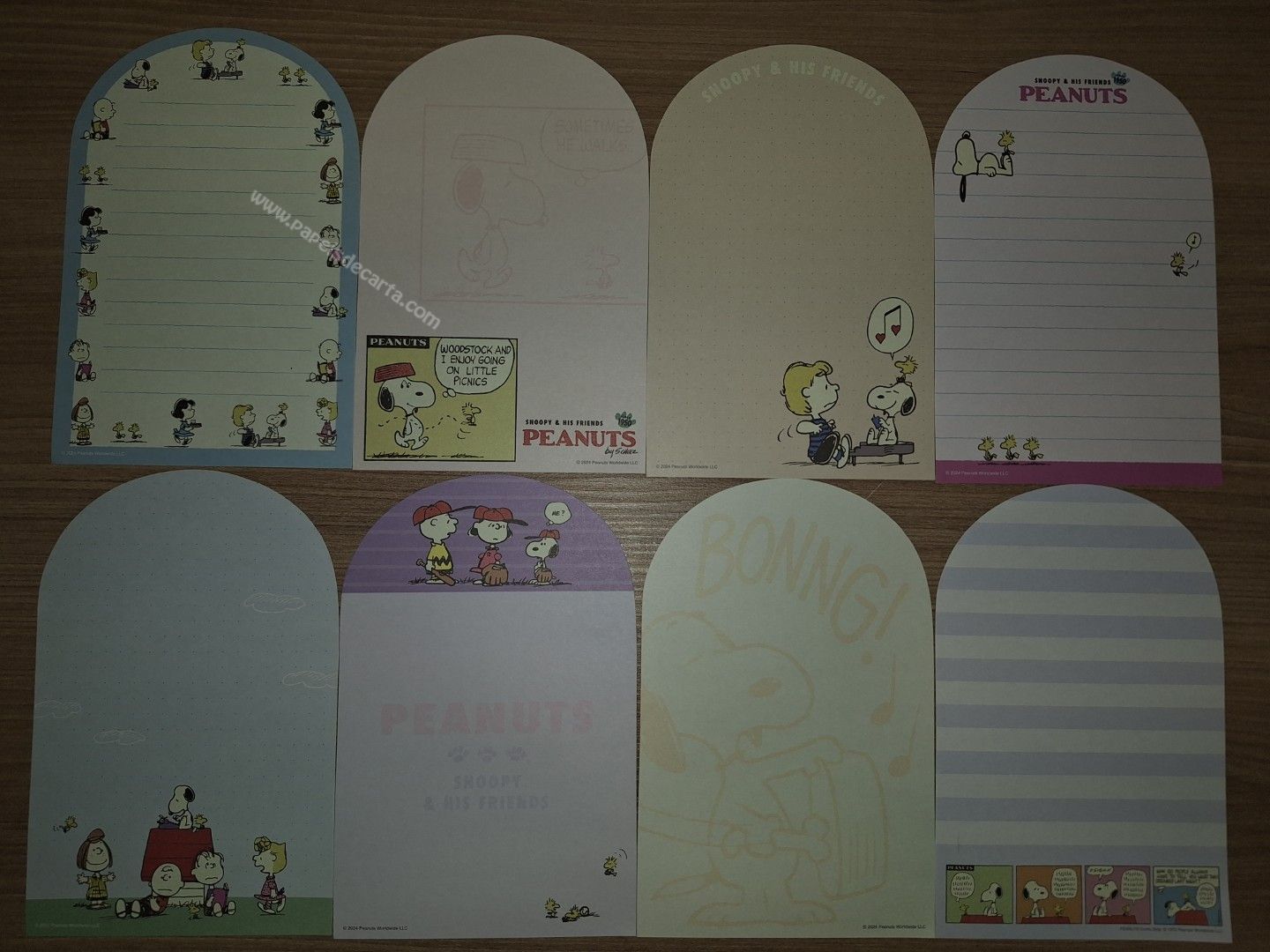 Lote com 8 papéis de carta importado, tamanho pequeno do Snoopy. Medidas: Larg: 10,5cm x alt: 16cm.
