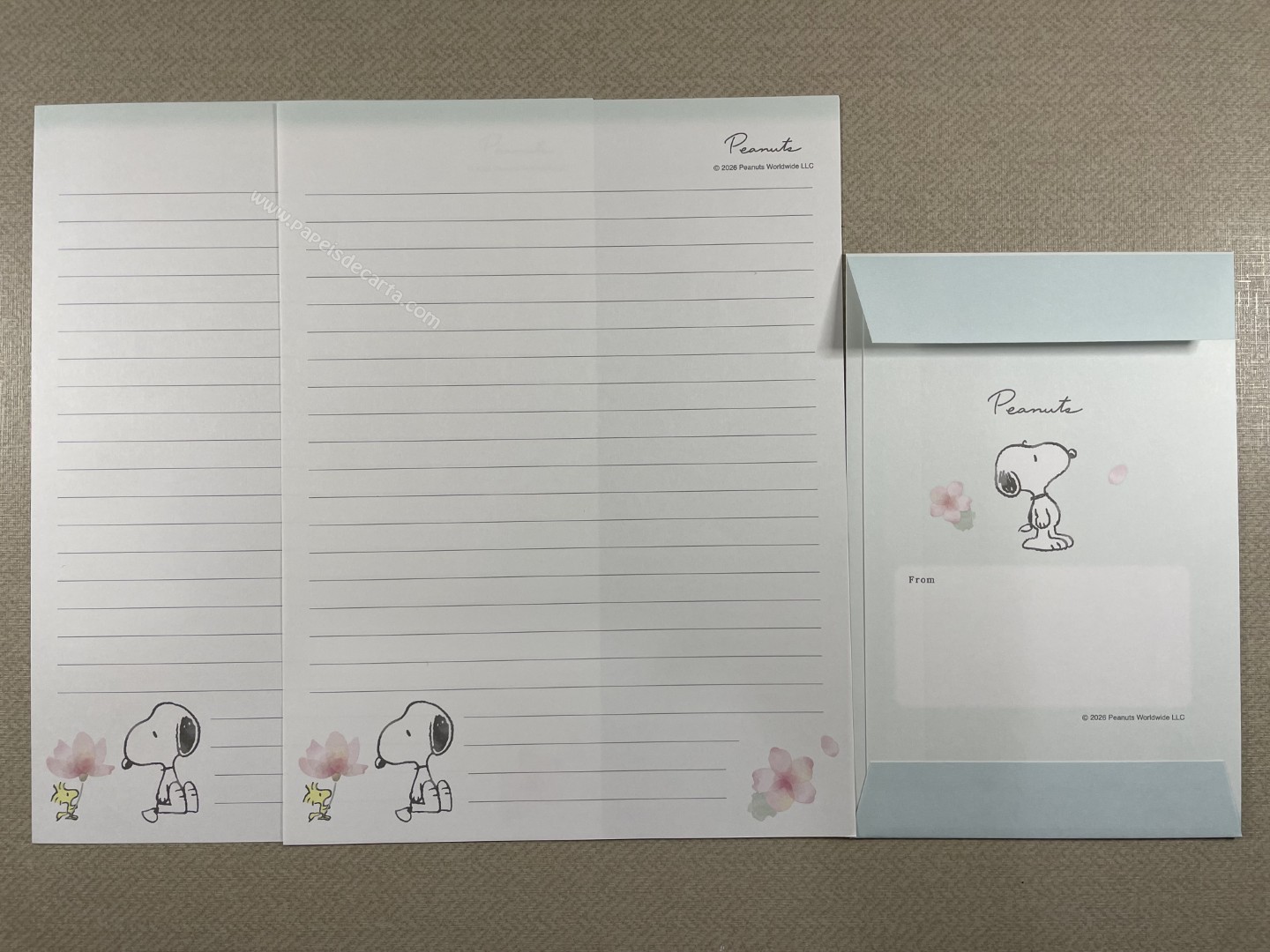 Conjunto de Papel de carta importado do Snoopy, com 2 folhas e 1 envelope. Tamanho médio.