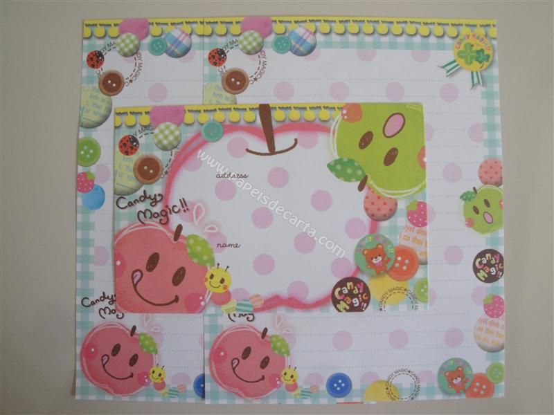 Conjunto importado, de papel de carta com 2 folhas iguais e 1 envelope do Candy Magic.