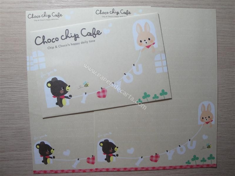 Conjunto importado, de papel de carta com 2 folhas iguais e 1 envelope do Choco Chip Cafe.