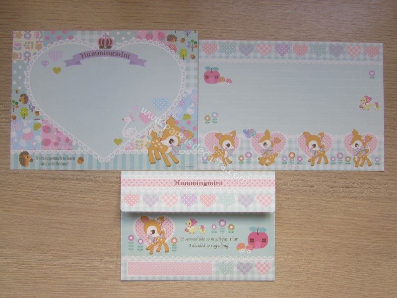 Conjunto importado, de papel de carta com 2 folhas diferentes e 1 envelope do Hummingmint, da Sanrio.