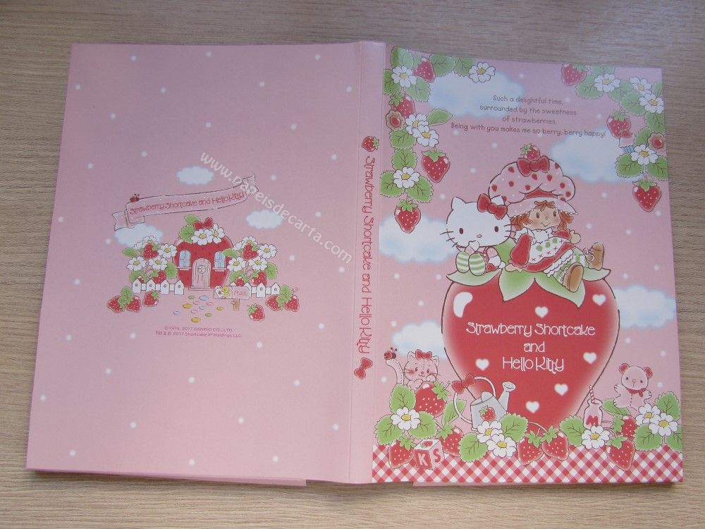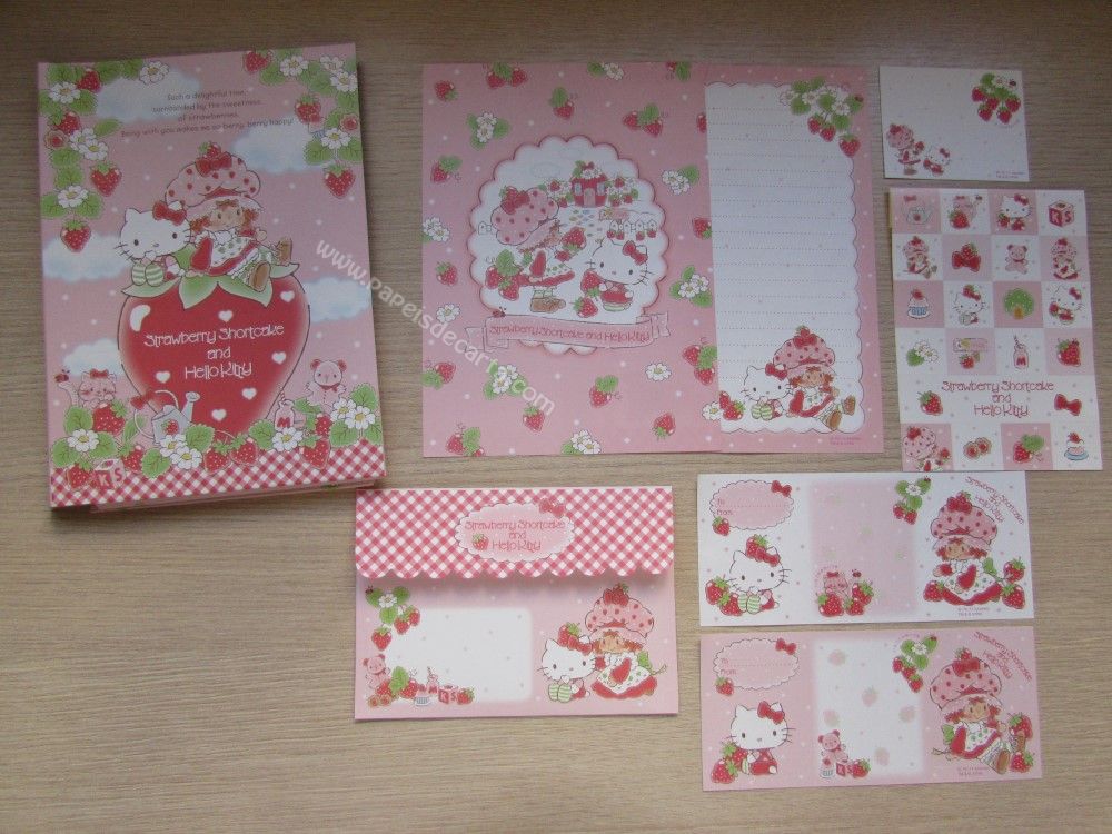 Conjunto importado, de papel de carta da Hello Kitty and Strawberry Shortcake, com 2 folhas diferentes, 3 notinhas, 1 envelope, 1 pastinha em papelão e 1 cartela de adesivos da Sanrio.