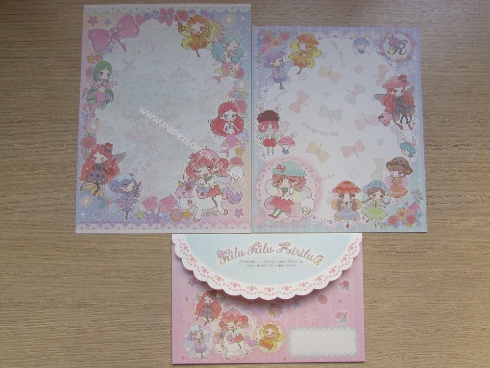Conjunto importado, de papel de carta da Rilu Rilu fairilu, tamanho médio, com 2 folhas diferentes e 1 envelope, da Sanrio.
